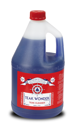 La pulizia del teak è un problema che viene spesso risolto con sistemi, come la carteggiatura o l’utilizzo di detergenti in polvere o estremamente caustici, che finiscono per danneggiare gravemente la superficie. Il TEAK WONDER® CLEANER è un potente detergente che pulisce a fondo il teak, facilmente e con poca fatica, senza che sia necessario carteggiarlo. Il prodotto non è né caustico né aggressivo e non danneggia la gomma dei comenti, le vernici o la ferramenta. Il grigio dell’ossidazione e lo sporco vengono rimossi in pochi minuti. Il processo di pulizia consiste nel bagnare la superficie da pulire con abbondante acqua dolce, poi cospargere il prodotto uniformemente e lavare la coperta con una spazzola non troppo dura (per non rovinare le fibre del teak), quindi risciacquare immediatamente e abbondantemente. Su superfici molto sporche, notevolmente ossidate o che non vengono pulite da lungo tempo potrebbe essere necessario ripetere il trattamento. Pulire le eventuali colature sulle superfici non in teak.
